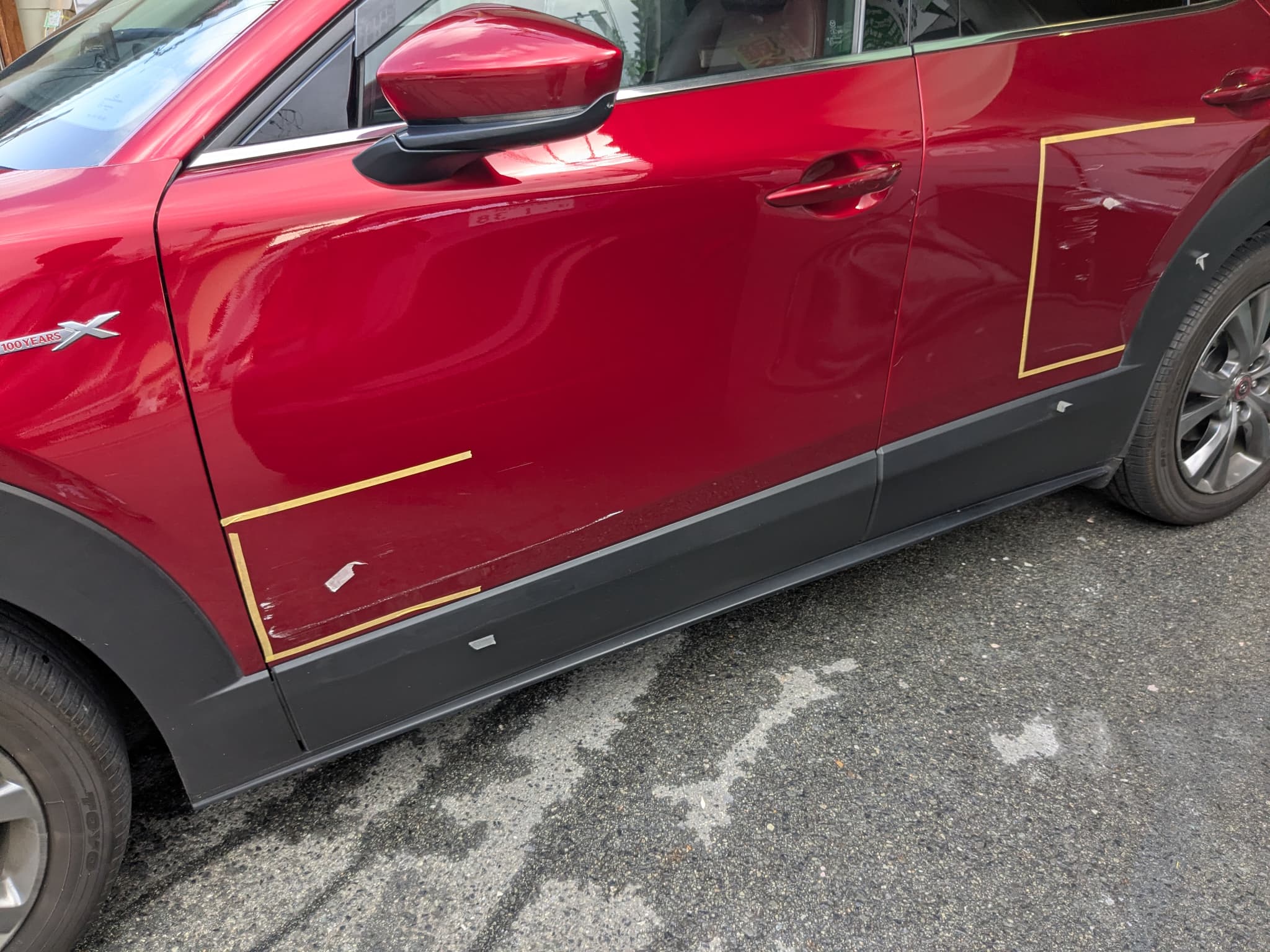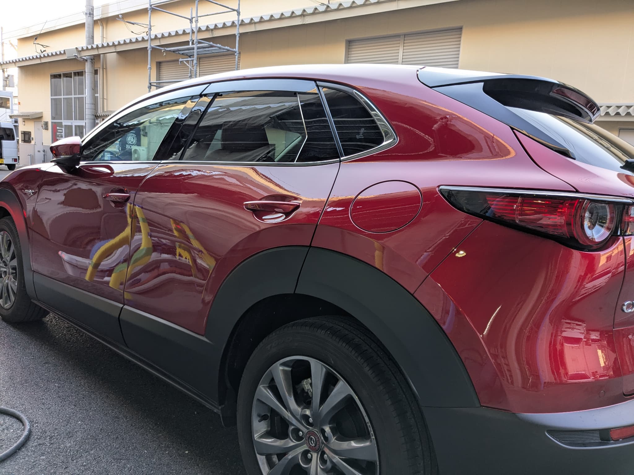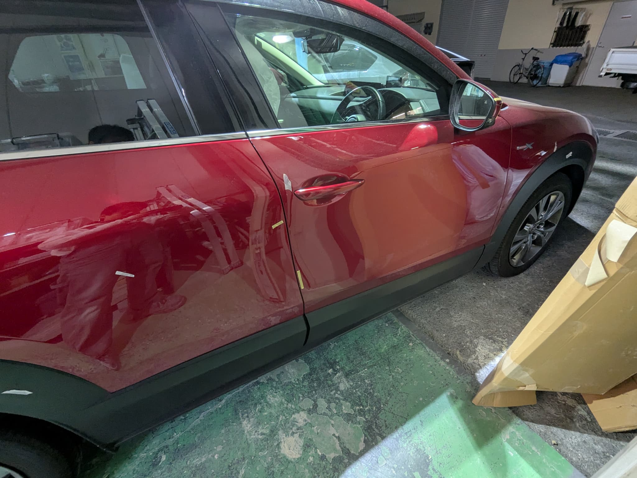 Before After 修理前の状況 左フロントフェンダー 傷 3か所 左フロントドア へこみ 左フロントドア 傷 左リアドア 傷 2か所 左リアドア へこみ 2カ所 左リアフェンダー へこみ 右リアドア へこみ 右リアドア 傷 2カ所 右フロントドア 傷 3か所 右フロントフェンダー 傷 脱着:前後バンパー、モール6か所 基本情報 対応車種 CX-30 費用目安 22 地域 大阪市池田市 施工中の写真